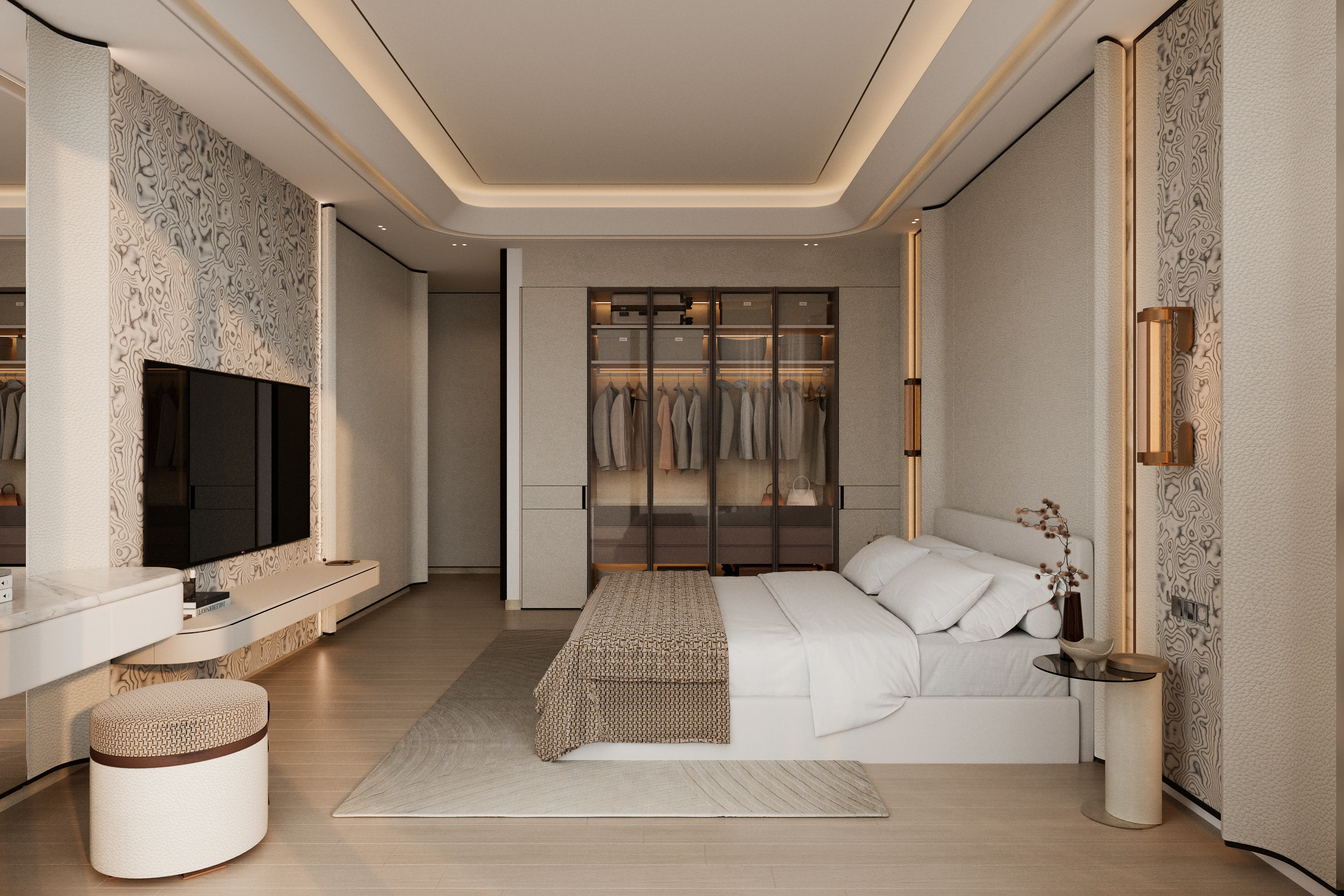 The interiors of Binghatti Vintage are crafted with intentional richness, showcasing a refined material palette of travertine stone, walnut, accent marble, brass, metallic glass, and light petal tones. The tactile textures and warm neutral hues create a serene, high-end atmosphere that balances modern luxury with timeless design. Each residence embodies comfort and depth, ensuring a sophisticated living experience for discerning homeowners.