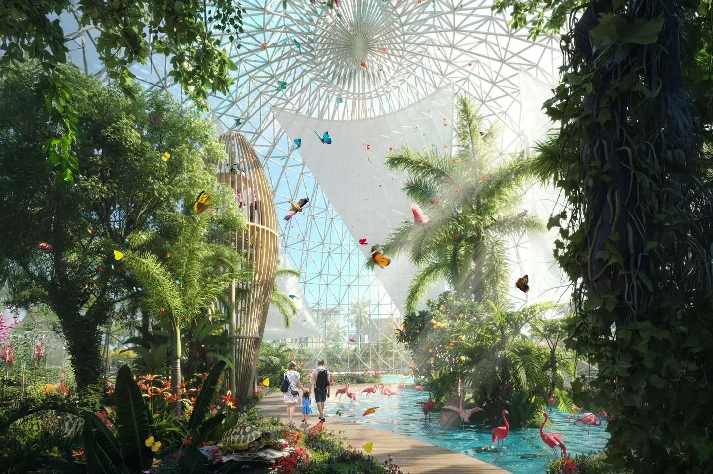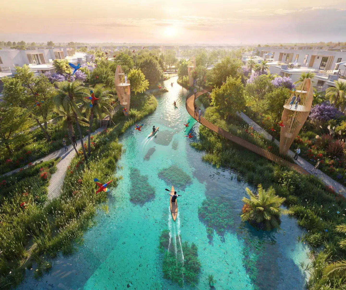 The community offers nature parks with a lake and waterfalls, a botanical garden, walking trails, and themed gardens. For active recreation, residents can enjoy kayaking, hanging bridges, observation decks, and sports facilities. The cultural component includes a museum, a library, art installations, and event spaces, forming an environment for living, relaxation, and social interaction.