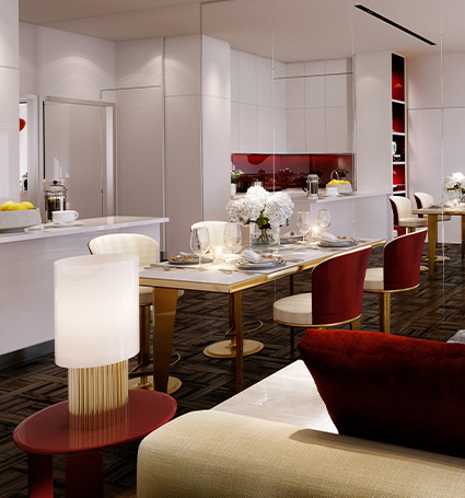 Inspired by the de Grisogono Signature rubies and the colour of chance, excitement and life itself. The Tower showcases stunning scarlet shades right from the magnificent lobby entrance to the interior detailing and furniture. its unique design, meant to emulate a cut diamond, is instantly recognisable from miles away. Each luxury apartment makes use of impeccable transformative living spaces , using movable walls to give you complete flexibility over your home.