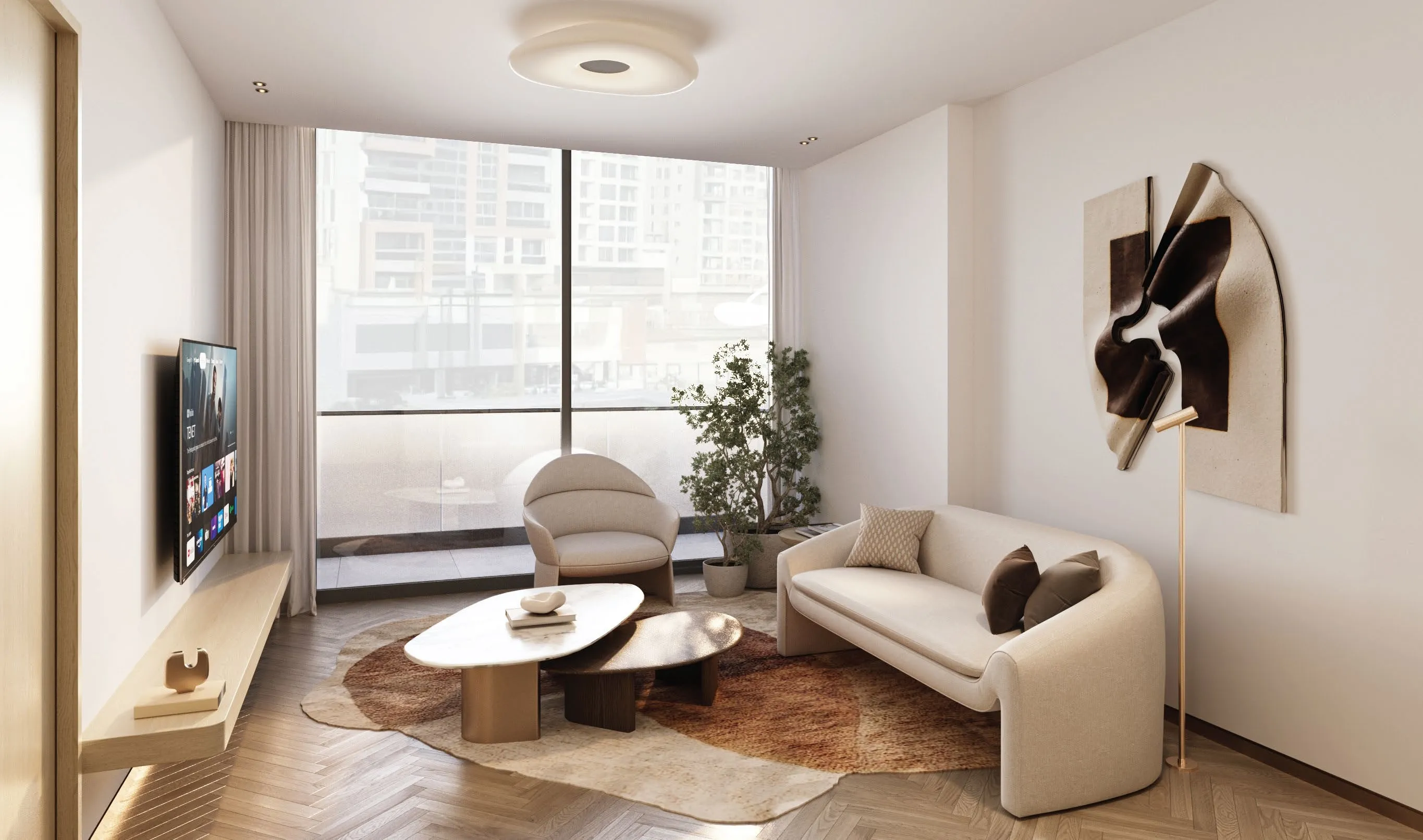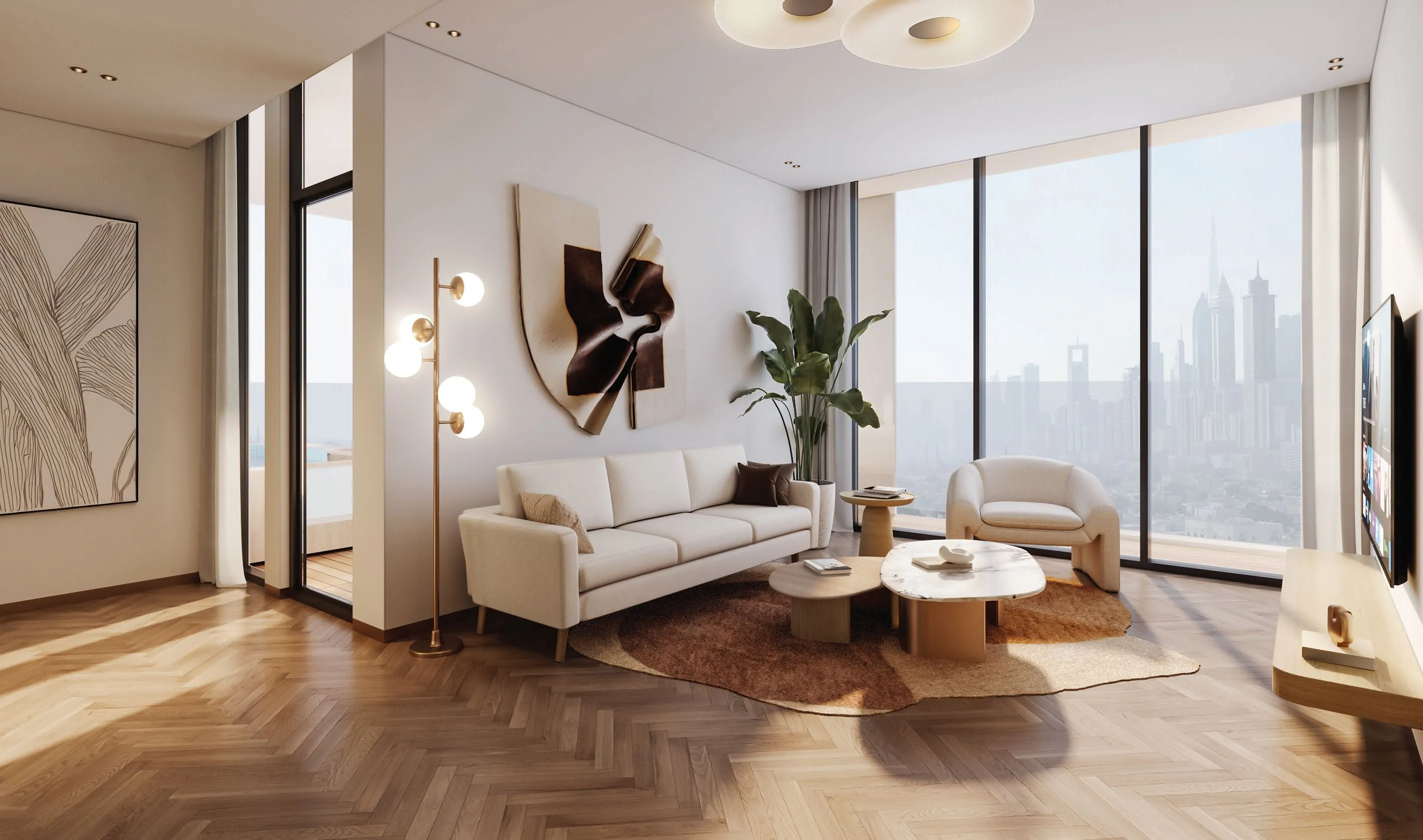 Interiors are finished with warm, high-quality materials that create a calm and elegant atmosphere throughout each home. Kitchens feature modern cabinetry, quartz countertops with terrazzo effect, and smart storage solutions, while bedrooms include built-in wardrobes with refined finishes. Flooring, bathrooms, fittings, and lighting are all carefully selected, combining wood-effect floors, porcelain tiles, brass accents, and floor-to-ceiling windows for a polished, contemporary, and luxurious feel.