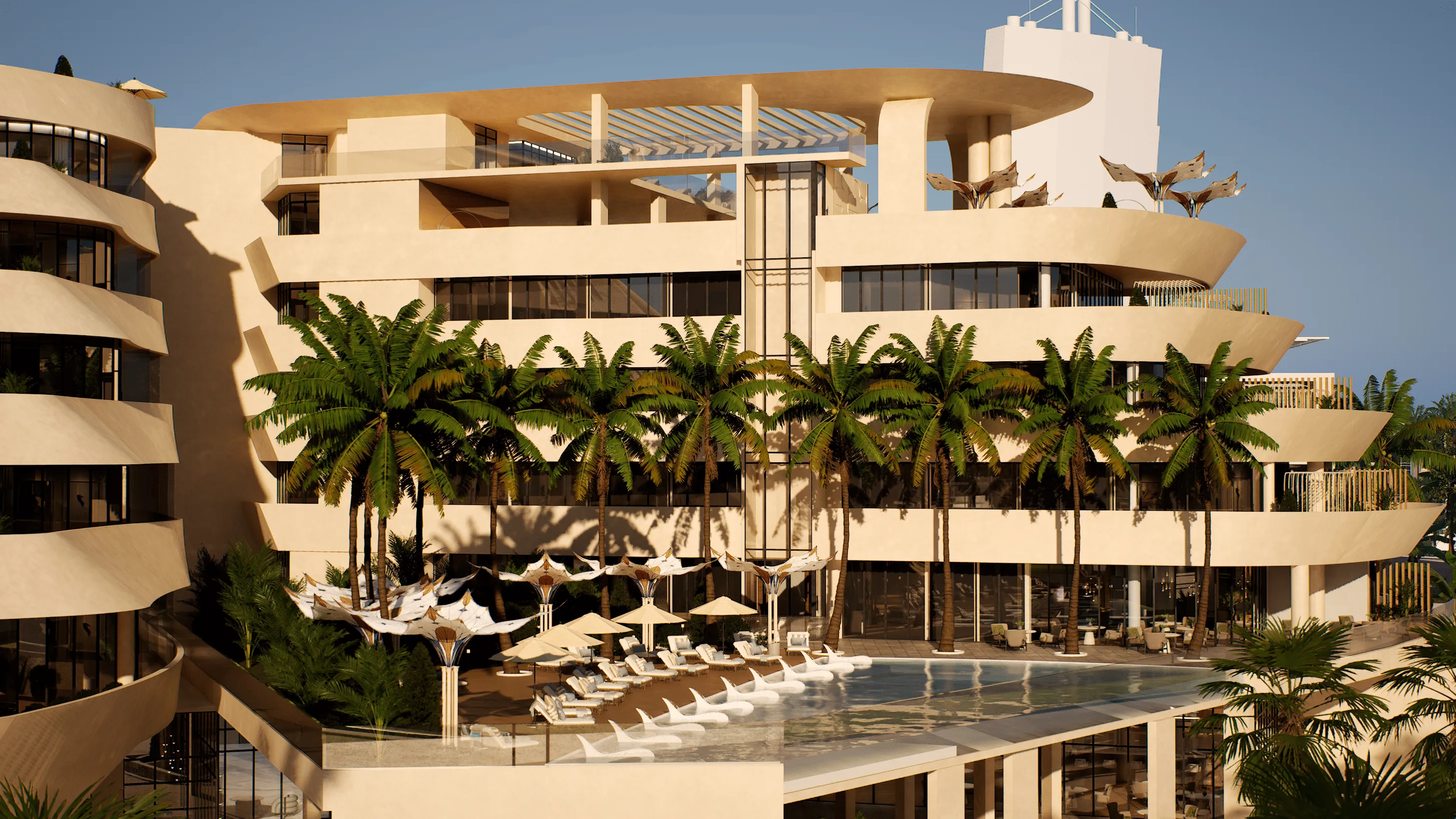 The amenities are shaped to reflect the grace and smooth motion of life onboard a yacht, featuring soft curves, warm lighting, and expansive glazing that fills every space with natural light. Each floor is imagined as its own “deck,” offering a seamless flow that enhances privacy, movement, and the feeling of five-star living. Shared areas encourage relaxation and meaningful connection, wrapped in an atmosphere of effortless sophistication and elegant design.
